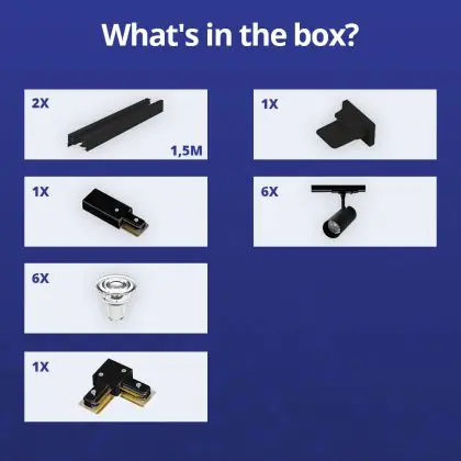 | Manufacturer Name | Complete L shaped 1-Phase Track Set Black incl. 6x Spot fixture + GU10 2700K 3W Dim – 1,5 x 1,5 mete | |