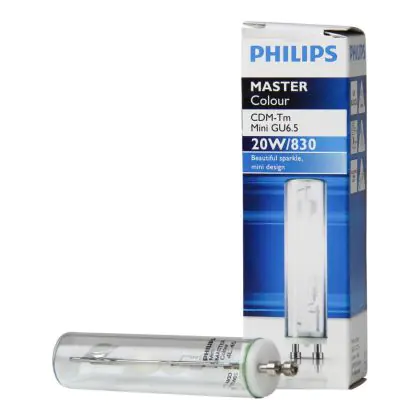 The Philips CDM-Tm Mini 20W 830 GU6.5 lamps emit a warm white light (3000K) to allow you to create an appealing ambience. The colour rendering index is also excellent, more than 80-89Ra.